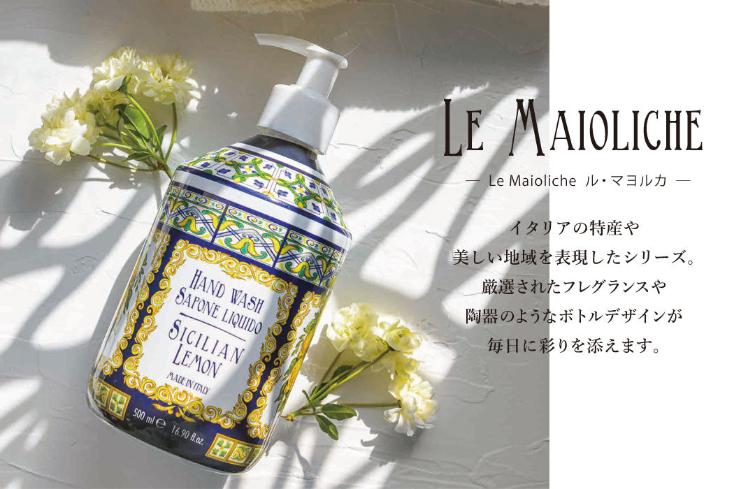 イタリアの伝統工芸の陶器【マヨルカ焼き】をオマージュしたパッケージが素敵な、「ル・マヨルカ」。イタリアブランドらしい、明るい陽光を感じるような華やかな香りとパッケージで、気分もパッと明るくしてくれるアイテムが揃います。